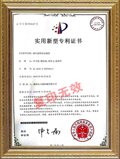 液壓滾筒動(dòng)力裝置新型專(zhuān)利證書(shū)