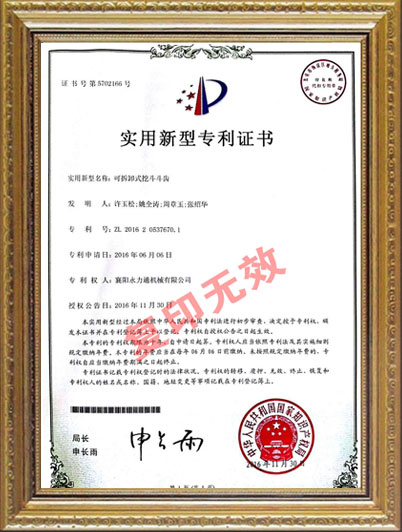 可拆卸式挖斗斗齒新型專(zhuān)利證書(shū)
