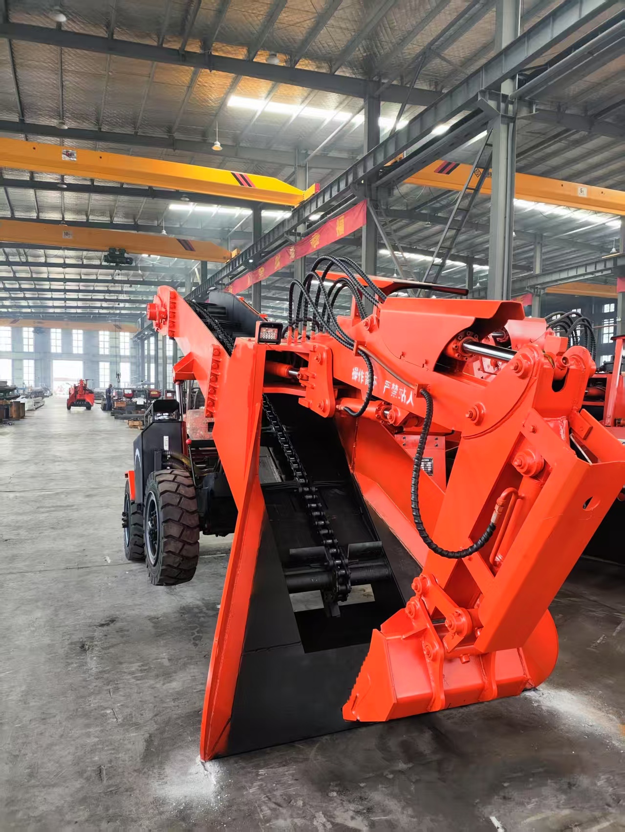 3、本機(jī)采用電動(dòng)全液壓傳動(dòng),液壓行走、挖掘采集、輸送、裝車四種功能,機(jī)構(gòu)緊湊,推進(jìn)力大,扒取范圍廣,可以全斷面裝巖,不留死角,不需人工輔助清理工作面